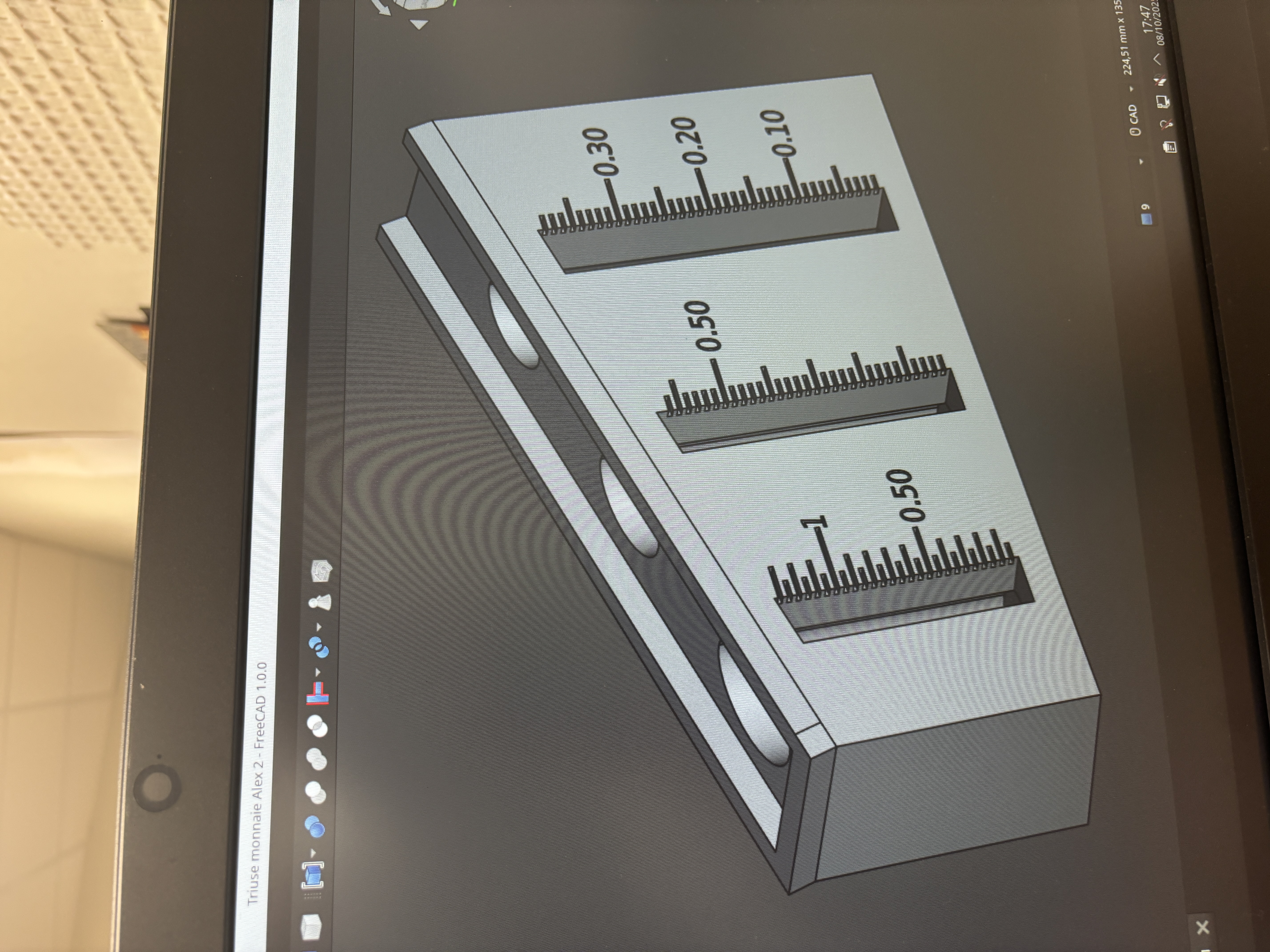 Aujourd'hui, ils m'ont fait faire une trieuse monnaie, en utilisant FREECAD.