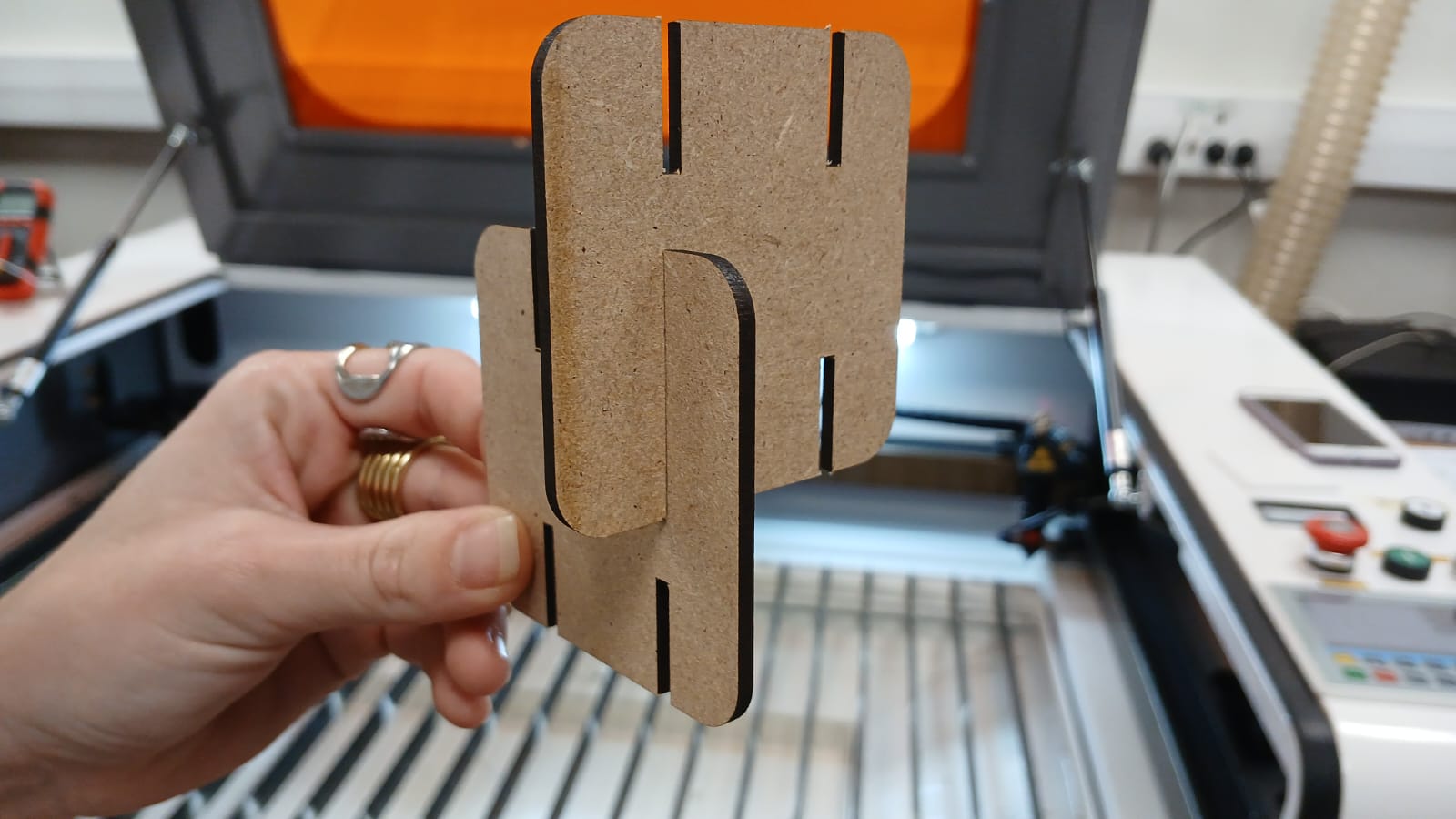 | Légende: Après divers ajustements nous avons trouvé le bon paramètre de découpe: vitesse 30 mm/s et puissance 100% | Légende: La pièce assemblée |