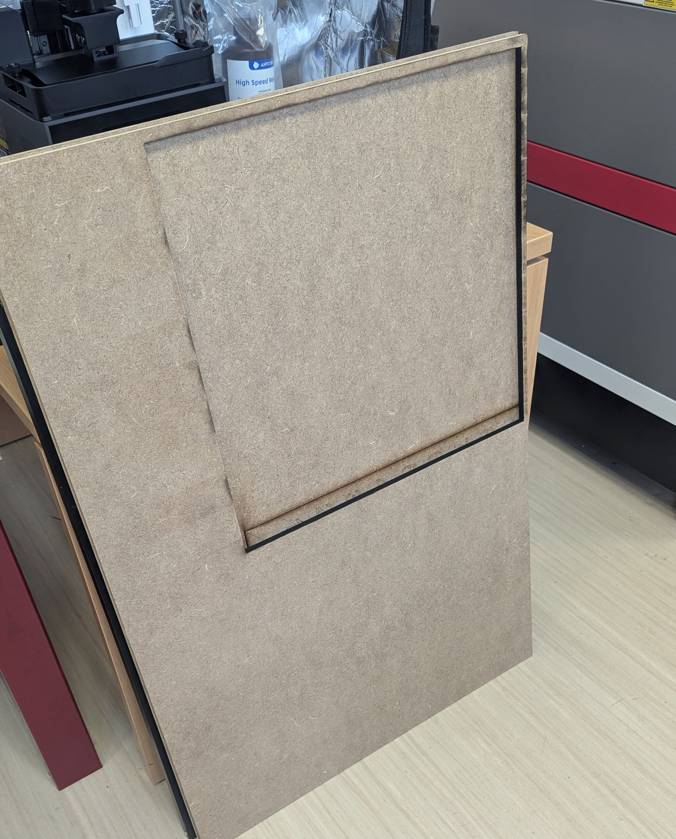 La découpeuse/graveuse laser a eu des soucis durant le processus décrit précédemment et il a fallu la rerégler plusieurs fois, d'où les échecs de découpe maglgré les nombreuses phases de tests.
