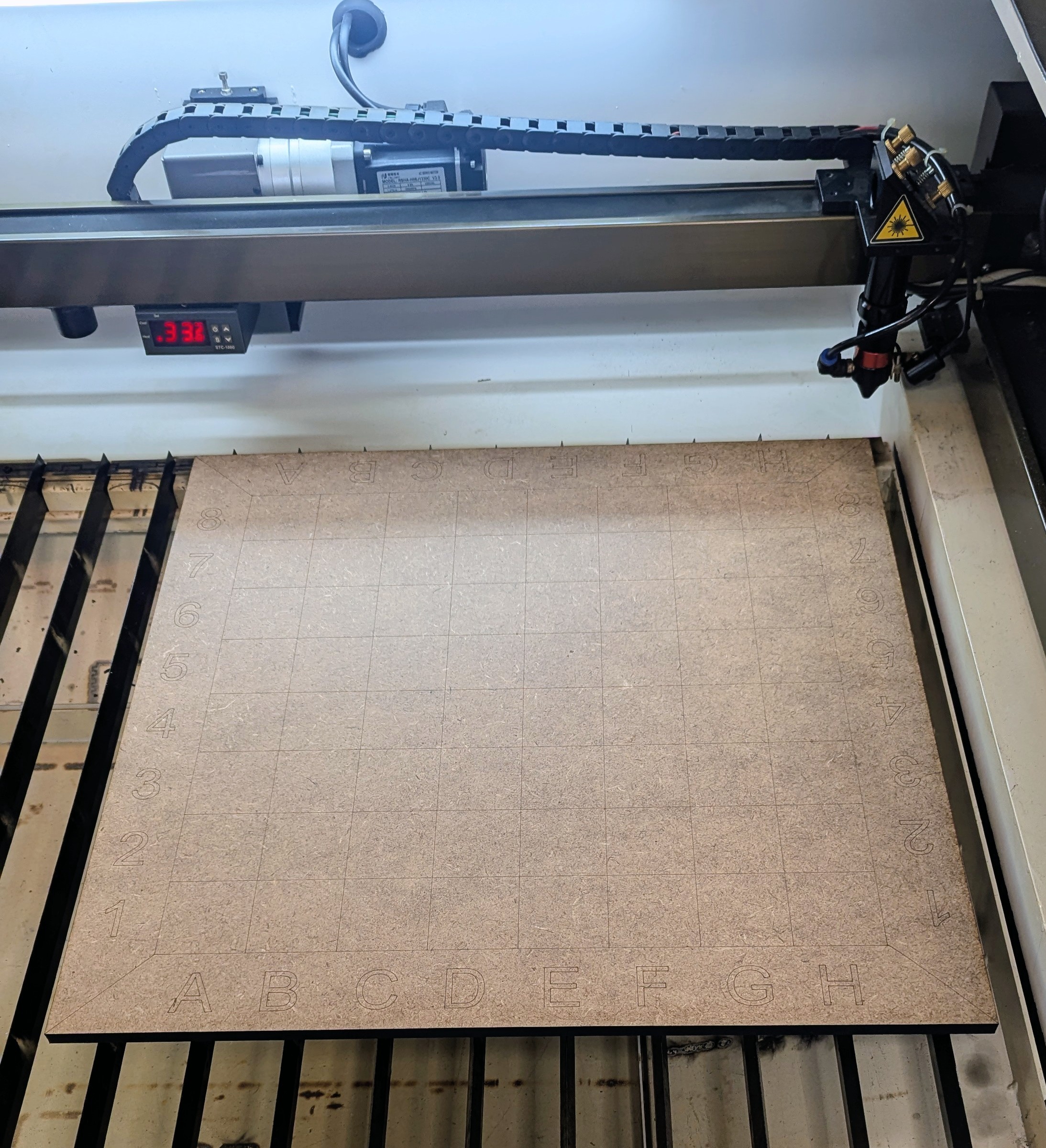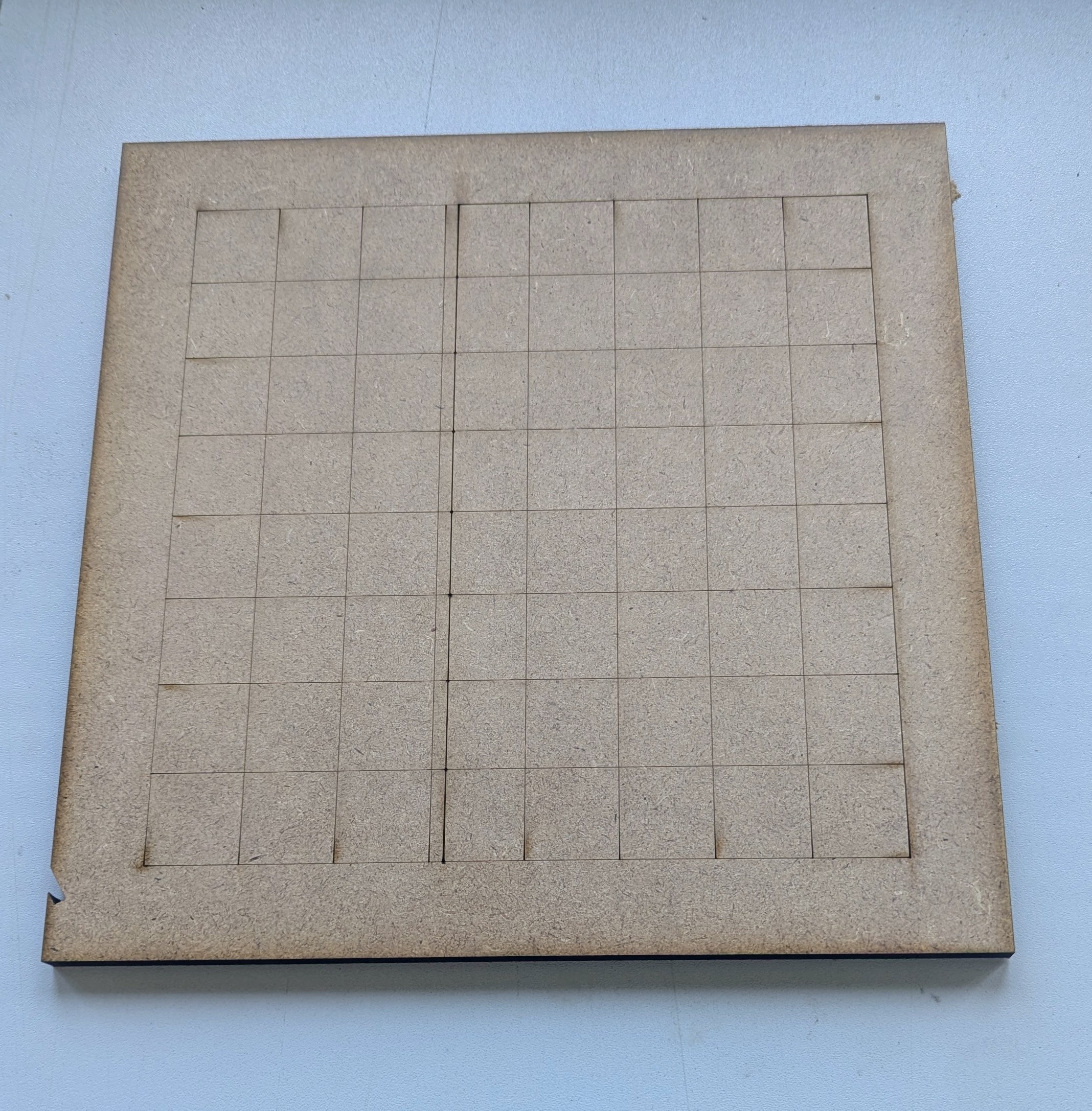 | Échiquier découpé et gravé | Planche MDF 10 après la découpe |