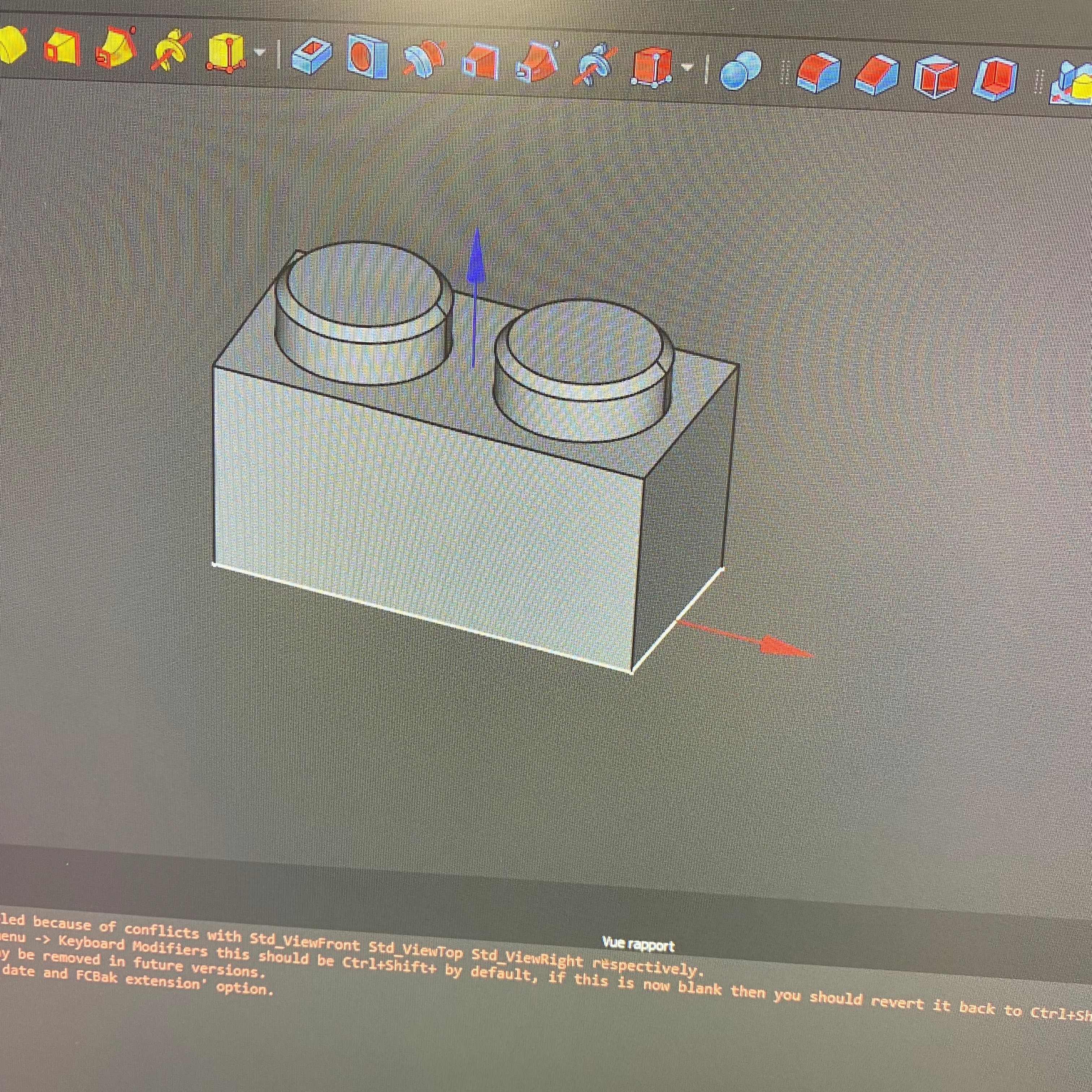 Modélisation en 3D d'une petite pièce de lego grâce au logiciel FreeCAD et à un tutoriel Youtube [[https://www.youtube.com/watch?v=vSbELT2rkaI ET https://www.youtube.com/watch?v=_vVdzOqbD50 + https://youtu.be/_vVdzOqbD50?si=A2FNGUBCOQYP-CVI]]
