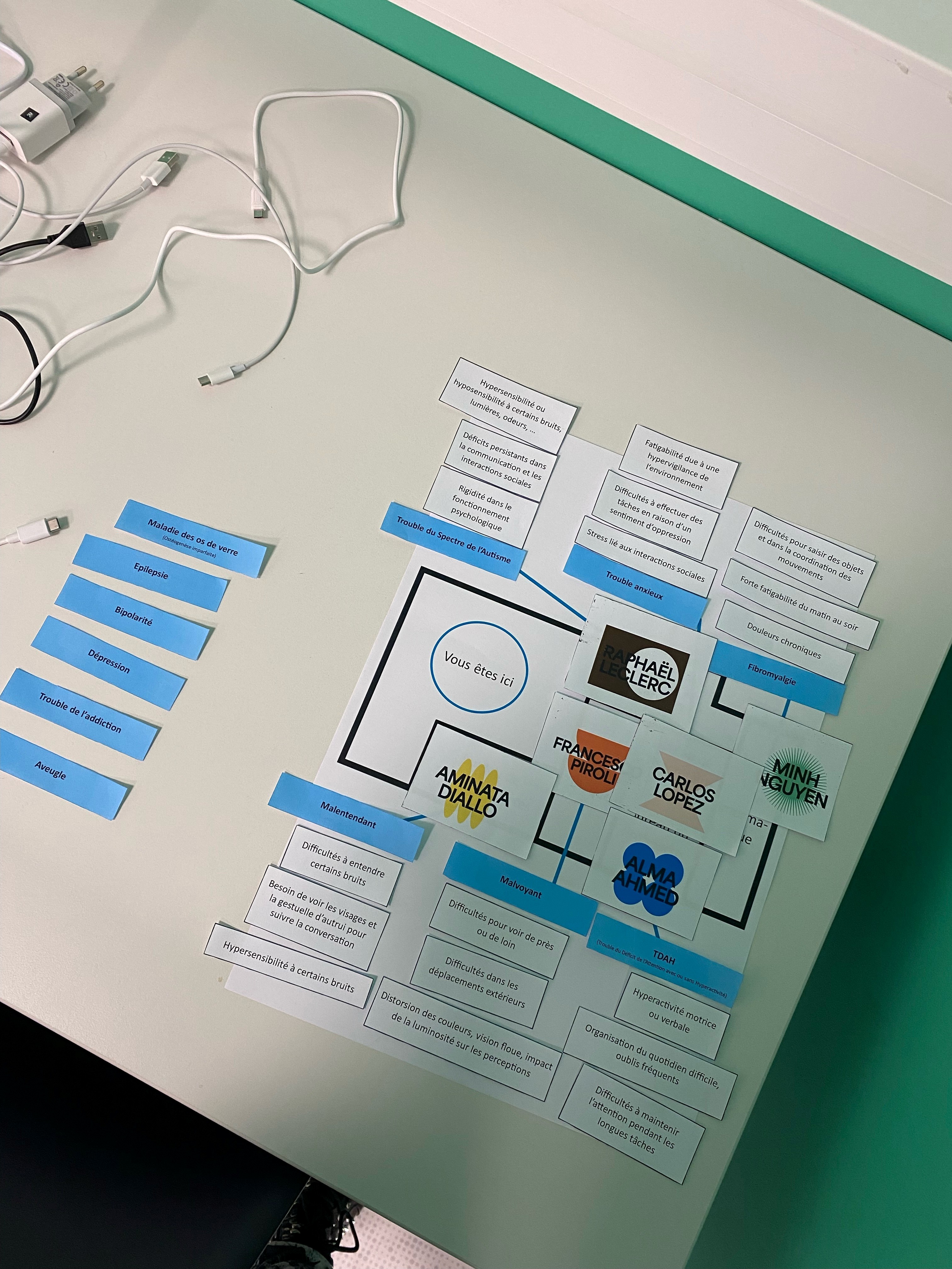 - Raphaël LECLERC, porteur de Trouble du Spectre Autistique (TSA) -> représenté par une visière pour donner au participant le sentiment d'être dans une bulle