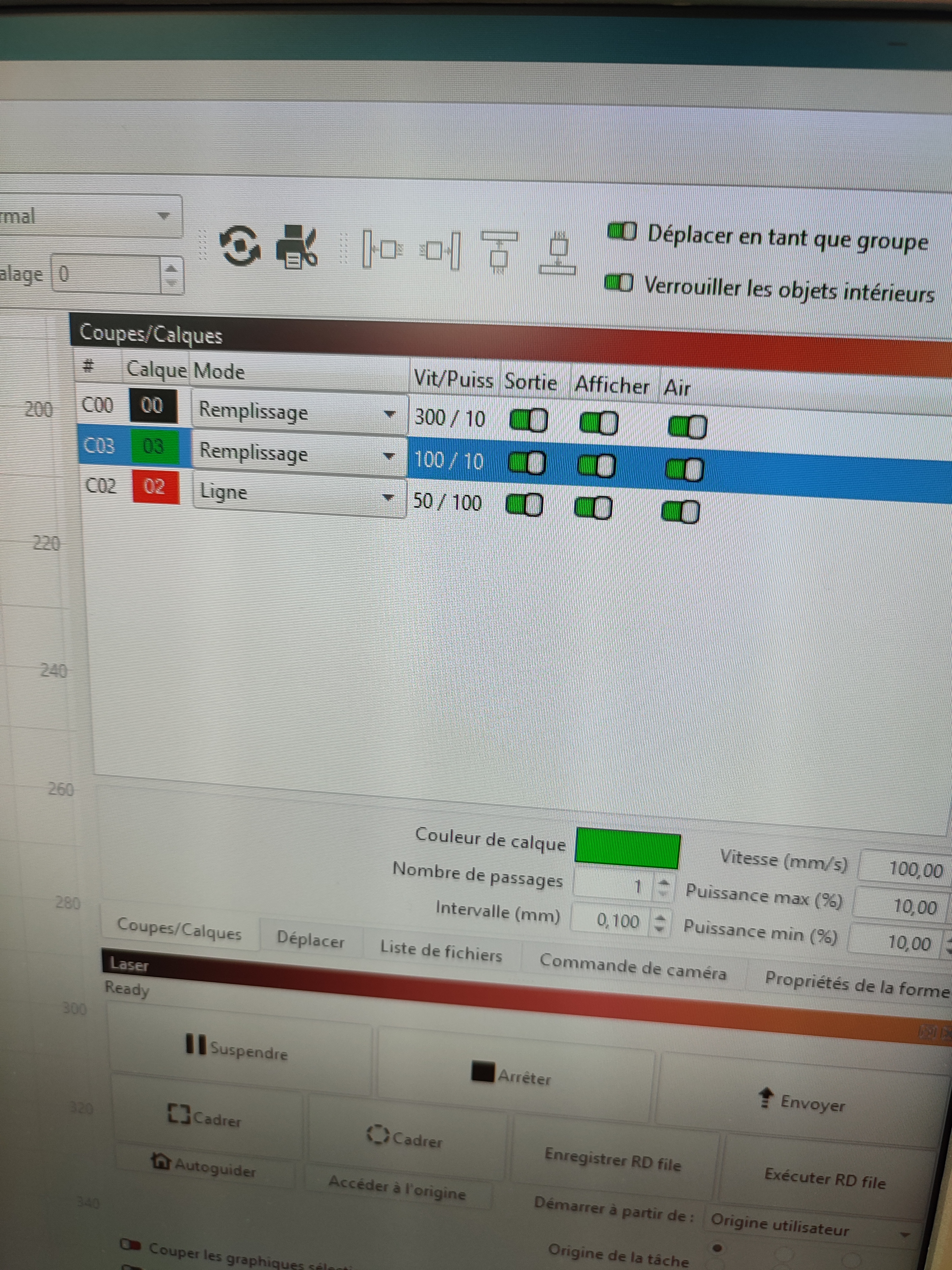 Pour garantir que la gravure n'aurait pas de trace de brûlure, et manquant d'informations sur le bois utilisé, nous avons mis la puissance a 10 et la vitesse à 300.