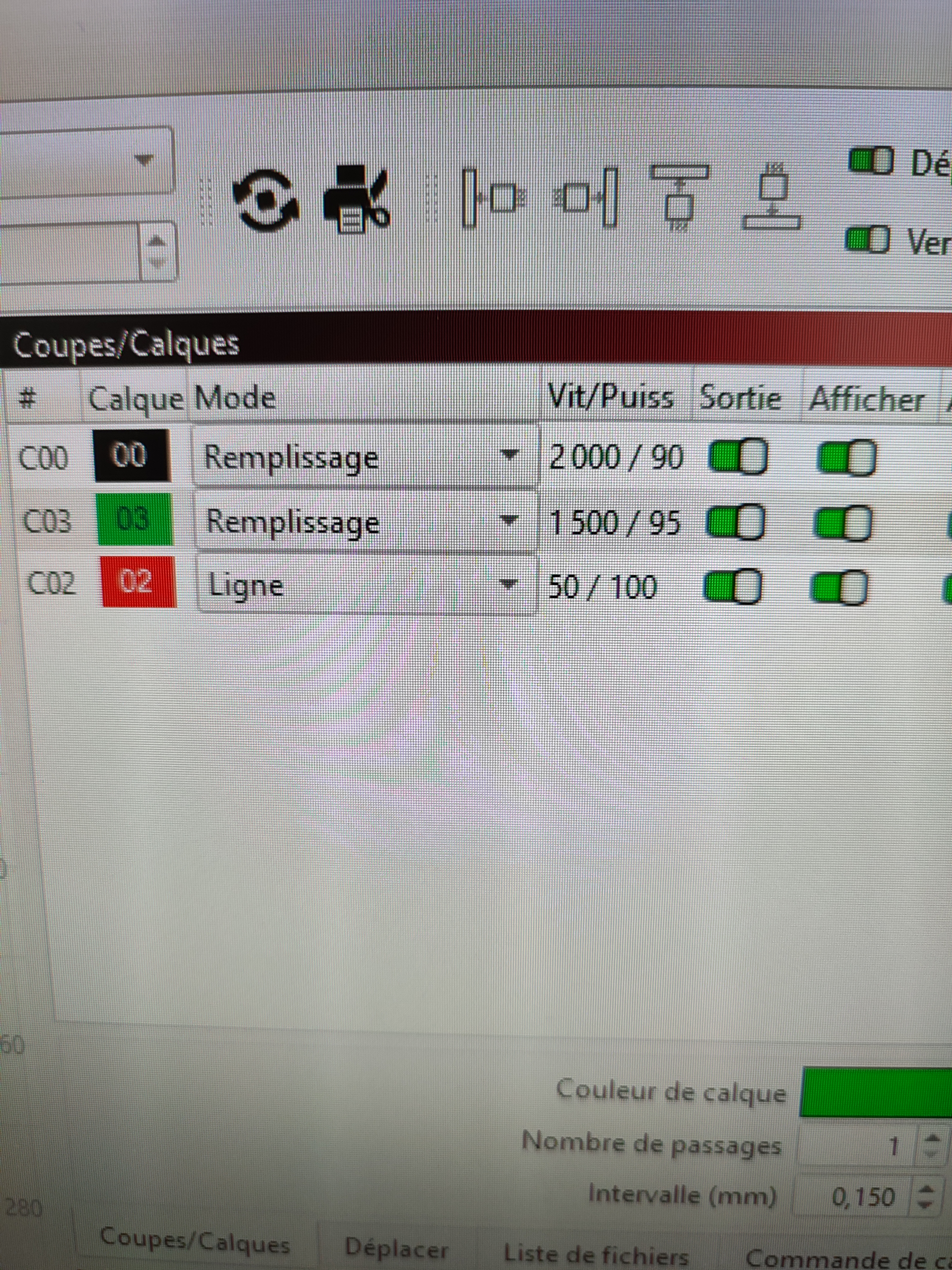 Pour la gravure, on a utilisé les paramètres enregistrés pour de la gravure en 1000 dpi, Puissance a 35% et vitesse a 2500.