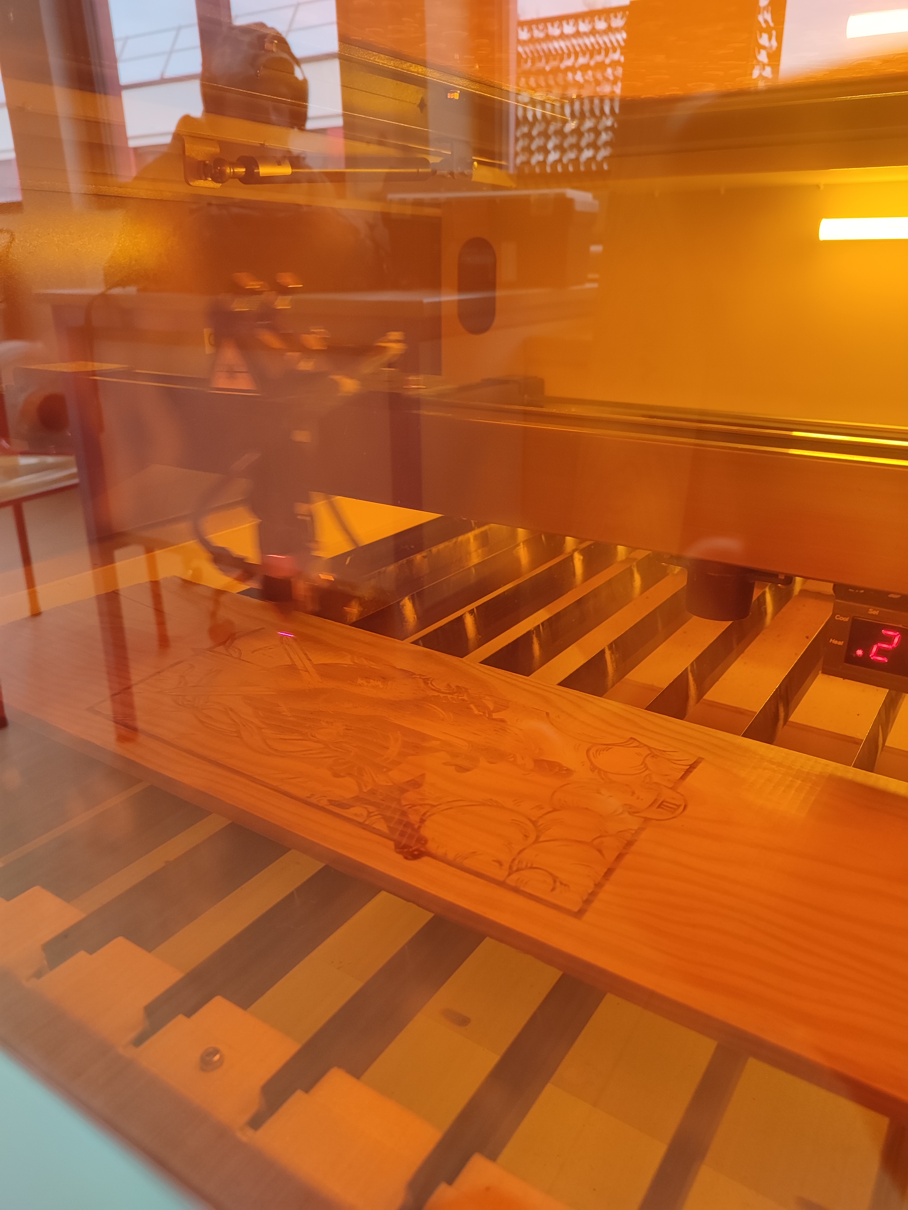 En dehors des découpes classique, nous avons expérimentés les gravure sur une planche de peuplier légèrement incurvée.