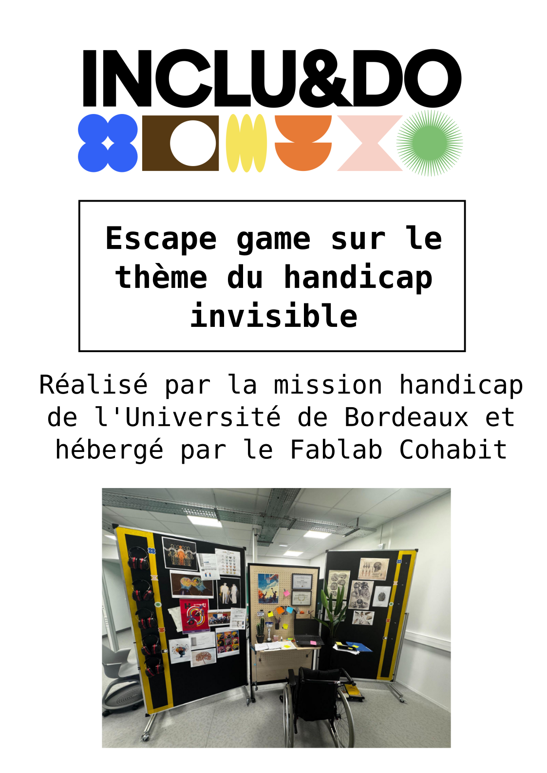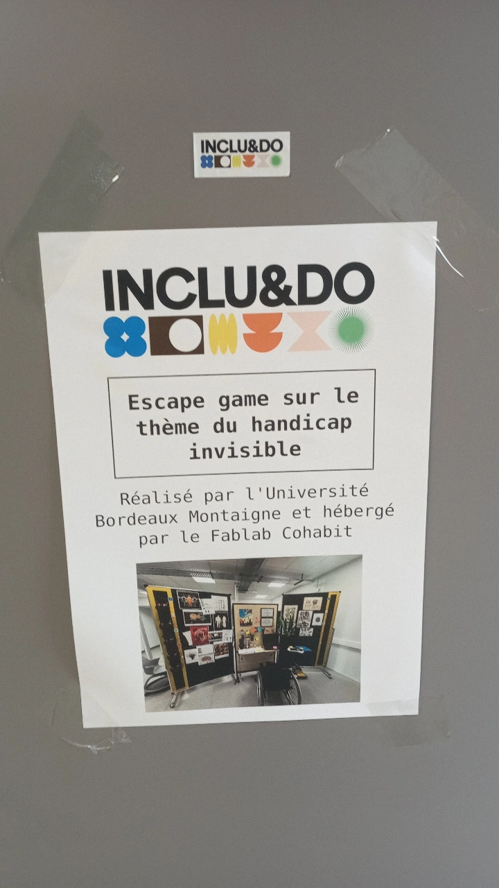| L'inclu&do est un escape game sur le thème de l'handicap invisible. Plusieurs séances de jeu sont prévues dans l'année et débuteront fin novembre 2025. Ce jeu a été conçu par des étudiant-es doctorant-es, notamment Jeanne Chouvac et supervisé par son tuteur Eric Dugas. L'escape game se joue sur deux salles différentes pour un temps total de 40 minutes à 1h de jeu. Un diaporama est proposé à chaque début de séances pour expliquer le déroulement du jeu : les participant-es vont devoir s'entraider. Il faut nécessairement 6 joueur-ses pour démarrer une partie. Ces 6 joueur-ses se verront être accompagné-es tout au long de la partie par les "maîtres du jeu", à savoir nous-trois volontaires. Nous aiderons au bon déroulement de la partie et assister les joueur-ses en cas de besoin. Les joueur-ses devront sélectionner un des six personnages qui leur seront proposés, représentés eux-même chacun par une couleur différente qui les aideront à emprunter le bon matériel. En effet, chaque personnage a son propre casier, sa propre fiche d'information de personnage et son propre téléphone portable. Il sera demandé aux joueur-ses d'incarner leur personnage et de se 'mettre dans leur peau' le temps des présentations. S'en suivra le début de la partie : les joueur-ses devront retrouver le dossier perdu d'une professeure et parcourir les différentes pièces afin de résoudre les énigmes et atteindre leur but. Une fois le jeu terminé, un debriefing sera proposé aux joueur-ses afin d'apporter de la communication, des ressentis et des informations supplémentaires au jeu. Il sera de nôtre responsabilité en suivant de recharger le matériel, ranger et potentiellement réparer le matériel utilisé. Le jeu a pour but de sensibilisation à la cause de l'handicap invisible et l'action anti-validisme. |