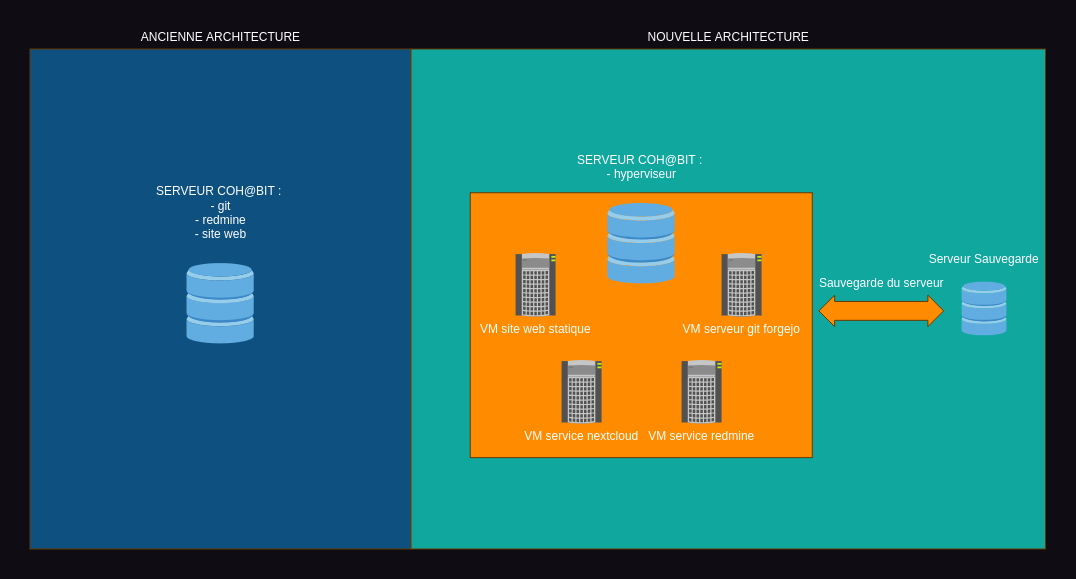 Notre travail consiste à mettre à jour l’ancienne architecture vers une nouvelle, basée sur Debian Trixie stable, avec un hyperviseur permettant de gérer différentes machines virtuelles (une VM par service).