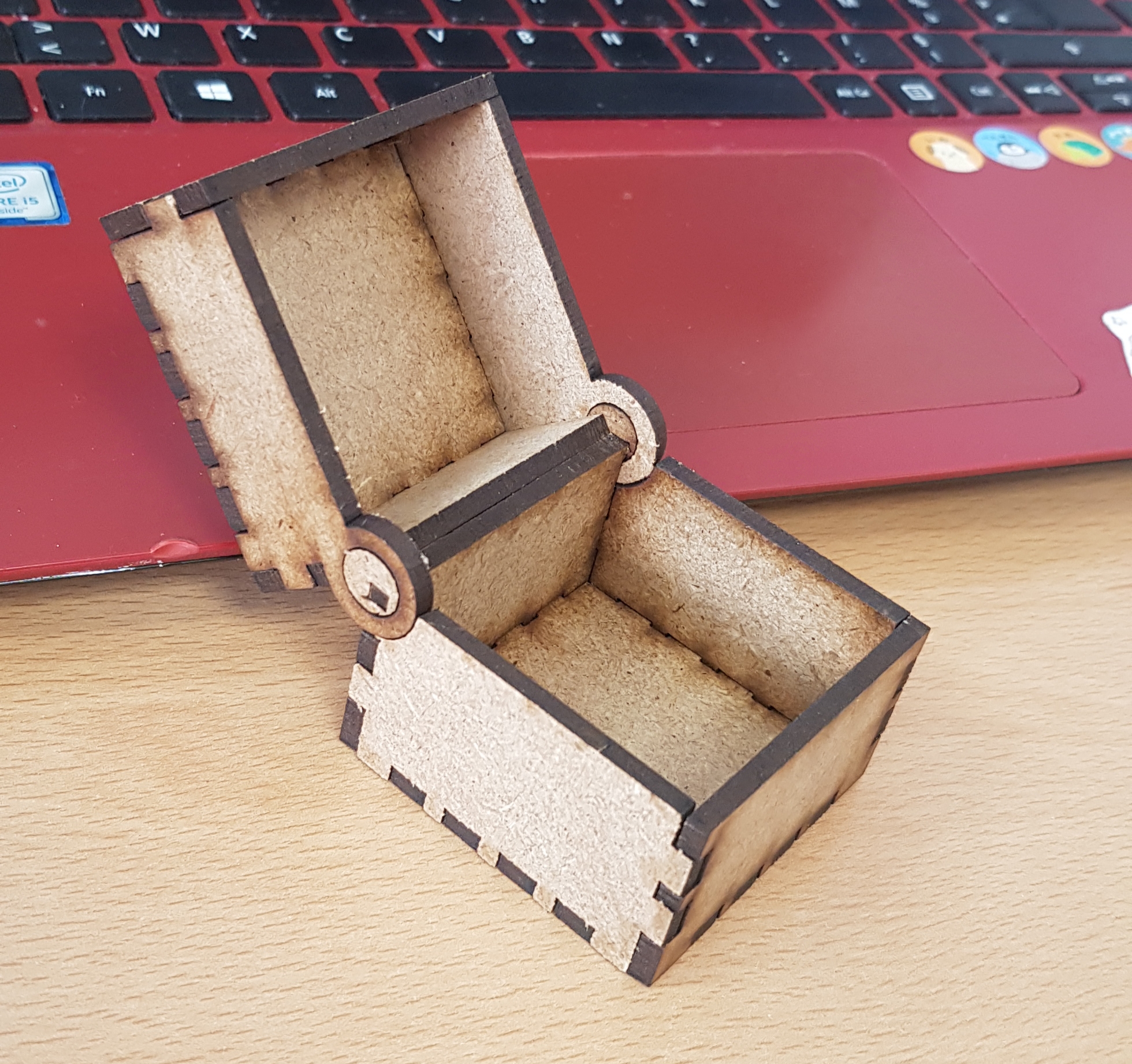 la découpe à très bien fonctionner, la boite se construit et s'ouvre bien, j aurais voulu que ce sois un cube parfait, la taille de la charnière est pris en compte dans la taille du couvercle donc on peu y ajouter la moitié de sa taille