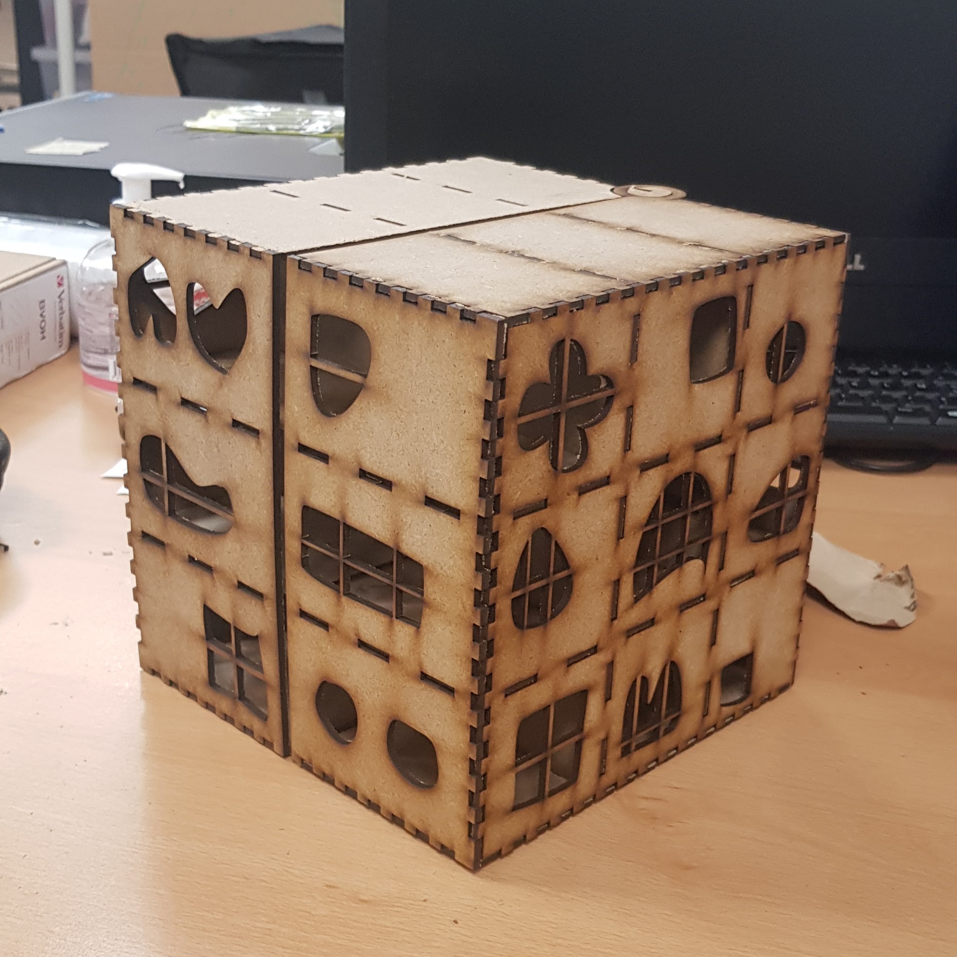 c'est difficile d'assembler car il y a beaucoup de pièce, l ordre le plus facile me semble de commencer par les grande face, y ajouter les séparation, et ensuite tout les coté, il faut terminer par le coté avec le cercle car c'est ce qui va fixer le système de charnière.