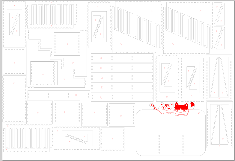 j'ai pu découper mon fichier dans la journée, il y a eu pas mal de problème, déjà la grande machine à découpe ne fonctionne pas trés bien est nécessite de la laisser refroidir régulièrement pendant la découpe, j'ai appuyer sur stop au lieux de pause, du coup j'ai d'enlever manuellement sur le fichier les découpe qui avait deja etait faite. également certaine découpe dépasser du cadre du laser du coup j'ai du bouger la planche et recalibrer le laser. pour ça c'est pas trés compliqué, je me base sur une forme de repère déjà découpe comme point d'origine que je passe en gravure, ainsi je peux tester si le laser et bien calibrer avant qu'il finissent la découpe.