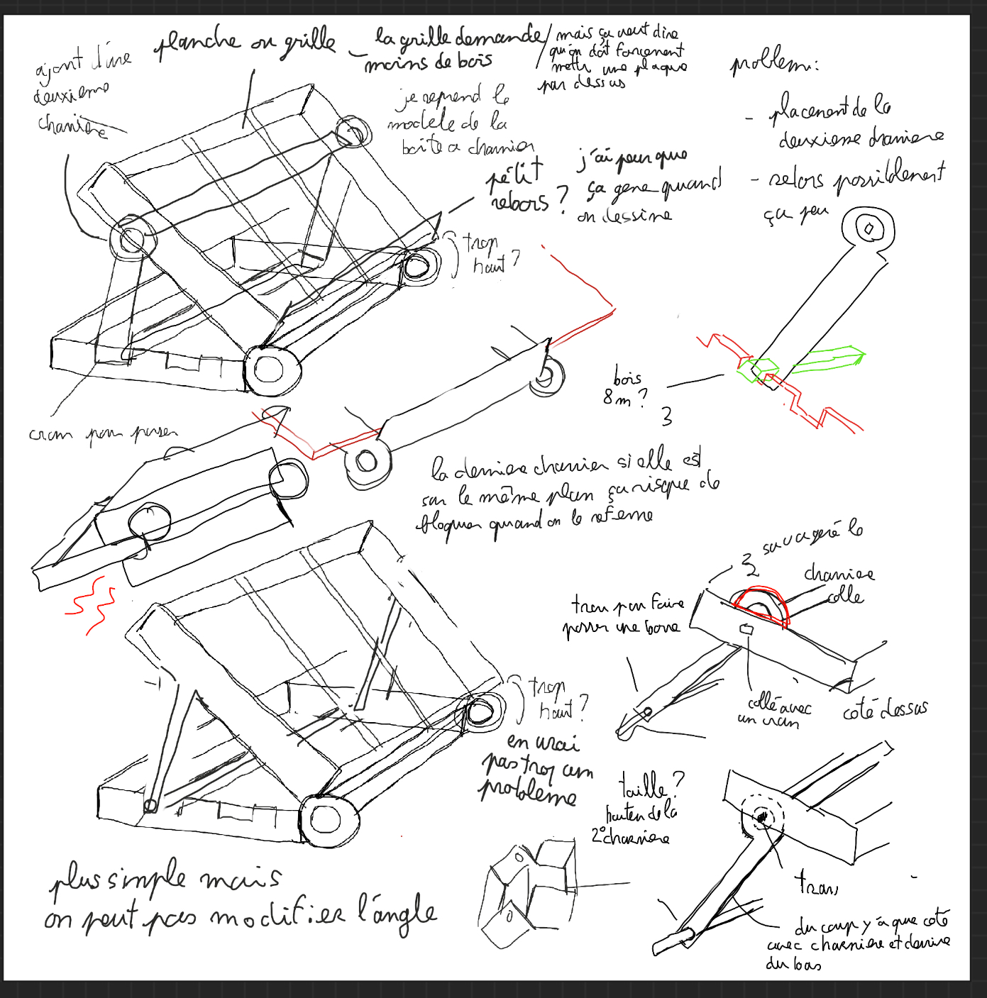 il faut revoir l'emboitement au niveaux de la dernière charnière, je pense le mettre plus loin de la première charnière, et peut être ajouter un espace ou la barre peux se ranger pour que la planche puissent être ranger totalement à plat.