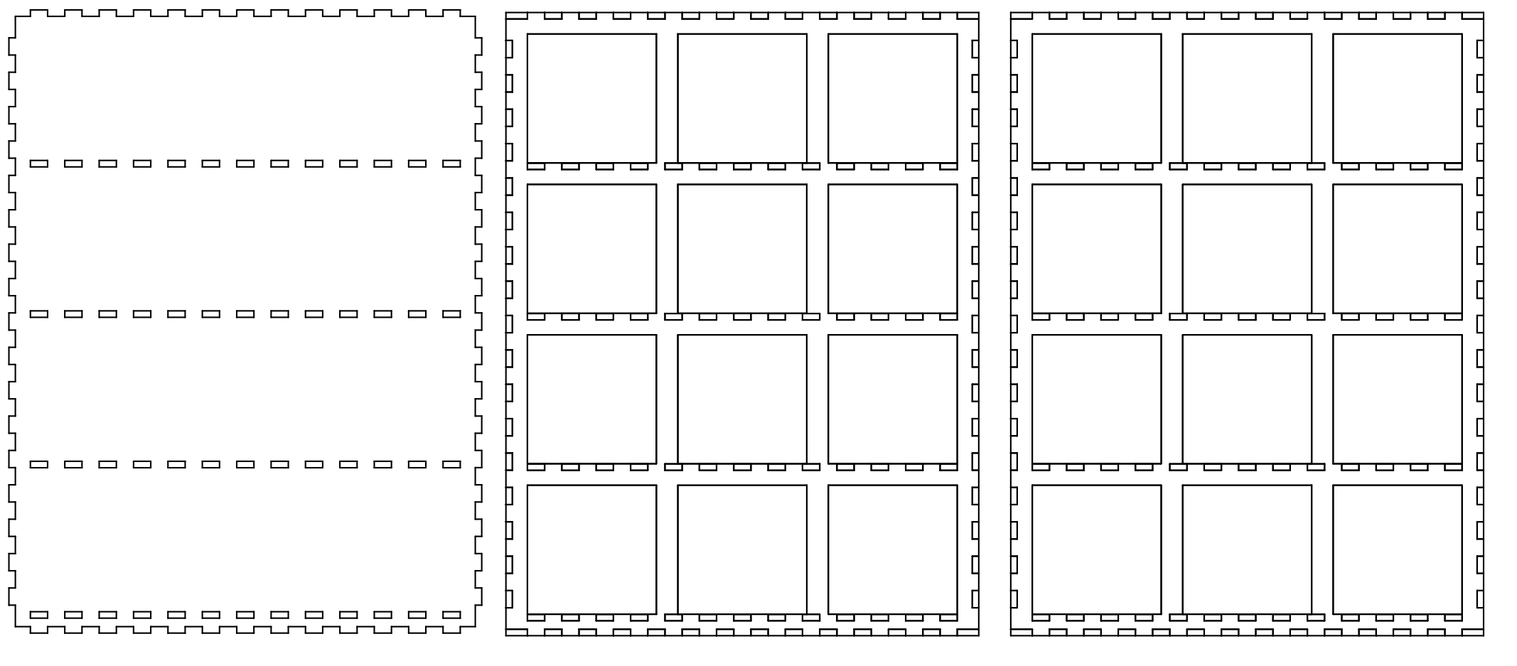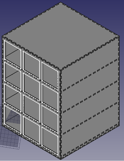 - "Le squelette", une boite de 22cm de long par 22cm de large, de 29cm de haut (dimensions extérieures) et de 3mm d'épaisseur. Avec 4 compartiments intérieurs, cette boite permet d'accueillir les 24 cases de notre calendrier. Elles seront reparties sur deux faces opposées, chacune séparée de seulement 1cm pour permettre une plus grande dimension de cadeaux tout en assurant la rigidité des faces !