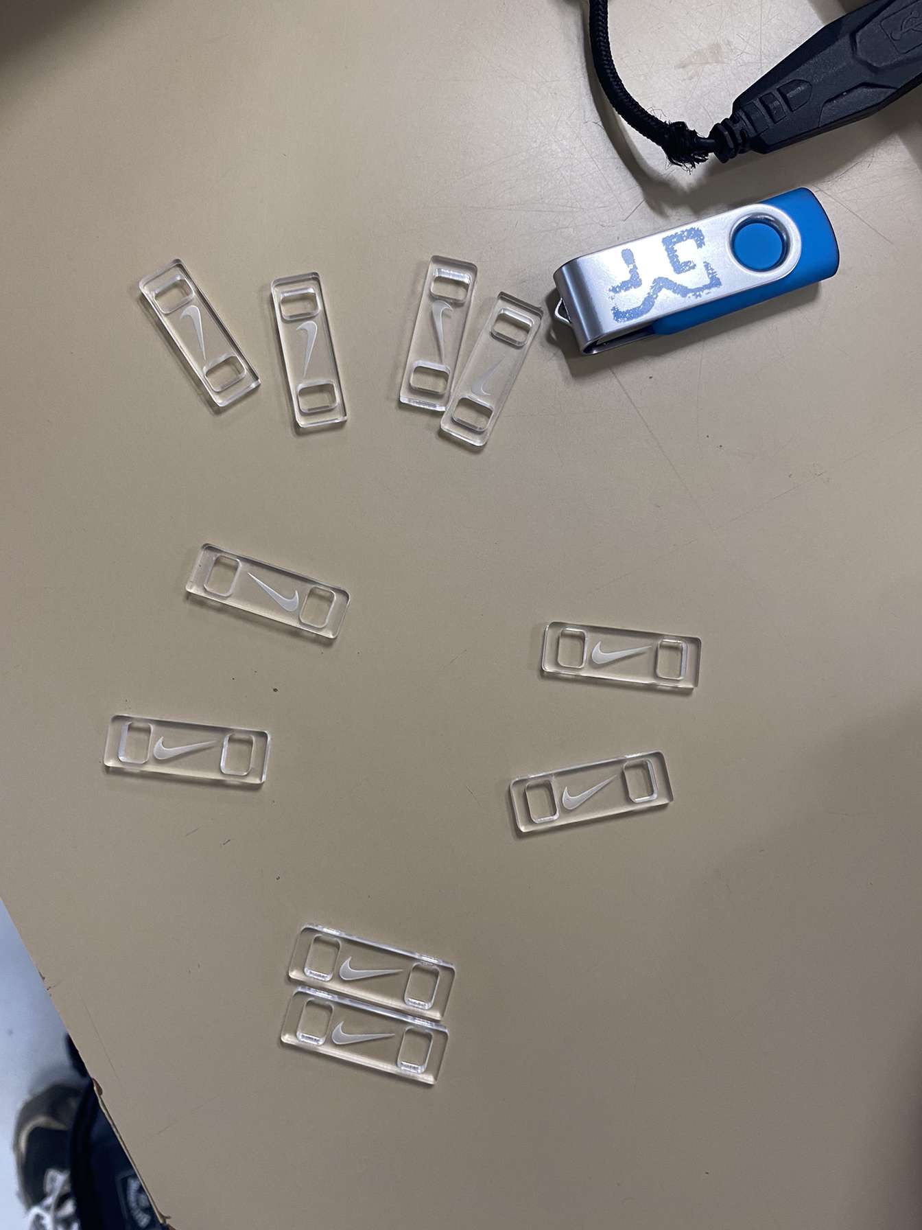 Ensuite nous avons réalisé des accessoires pour chaussure en s'inspirant des petites plaques en métal des chaussures Nike aire force 1. Nous avons donc pris les mêmes dimensions mais en changeant le logo du milieux par un logo Nike. Pour cela je suis allé sur Inskape et nous avons recréer la forme et vectorisé le logo Nike pour l'incruster sur notre petite plaque. Nous sommes ensuite allé sur la découpe laser et nous avons choisis du plexiglass car c'est ce qui rendais le mieux avec la gravure. Nous en avons fais 8, soit 1 pour chaque chaussures. la découpe à durée environ 6min