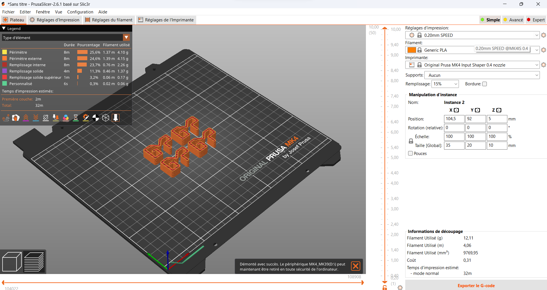 En ce qui concerne la réalisation du décapsuleur, nous avons rencontrés certains problèmes en raison d'un manque d’expérience lors de l'utilisation de freecad mais aussi par un manque de communication sur le design du décapsuleur. Pour commencer j'ai fais une première version mais je me suis rendu compte qu'il y avait trop de contraintes erronées et que les choix nous étais de soit tout recommencer ou de chercher méticuleusement chacune des erreurs. Nous avons donc choisi de tout recommencer sur un support vierge ce qui nous a conduit à réaliser une version finale bien plus sobre. Nous avons ensuite exporter l'extrude en STL pour ensuite l'importer sur PuraSlicer afin de pouvoir les découper virtuellement. Nous avons pu lancer l'impression 3D qui nous a pris environ 1h, pour 12,43g de filament soit 4,17m.