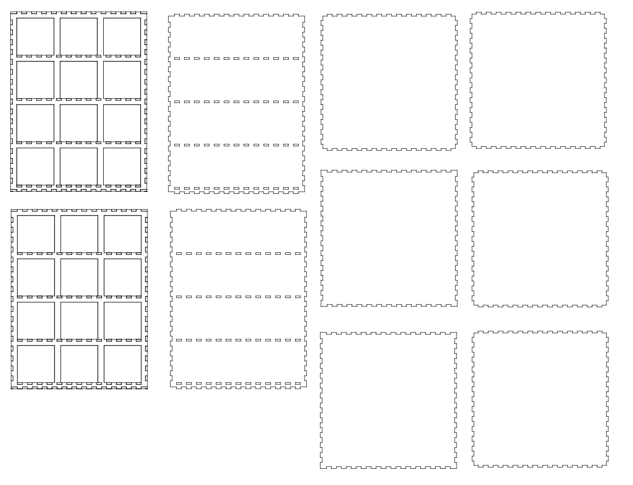 Dans une V2.0, pour réduire l'utilisation de plaque en bois, on compte redimensionner les compartiments intérieurs pour créer un vide au milieu de la boite (ce qui va également moins la contraindre en terme de poids) et faire rentrer plus de matière sur chaque plaque disponible (dans notre cas du 729mm par 430mm).