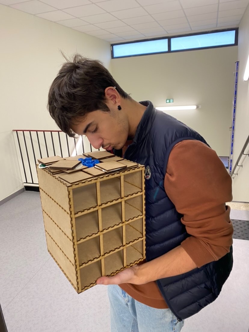 Pour finir, comme nous l'avons expliquer avant nous n'avons pas pu finir notre projet par manque de temps mais il nous restait pas grand chose à faire! Alexis avait tout fait sur freecad mais le matériel à disposition ne nous a pas permis d'imprimer en 3D la partie extérieure de la boite pour que ça ressemble à un sapin car c'était trop grand. Et nous n'avons pas pu faire les boites non plus car cela demandais trop de temps à découper et demandais trop de matière. Donc le projet est fini sur le papier mais nous n'avons pas pu tout concrétiser.