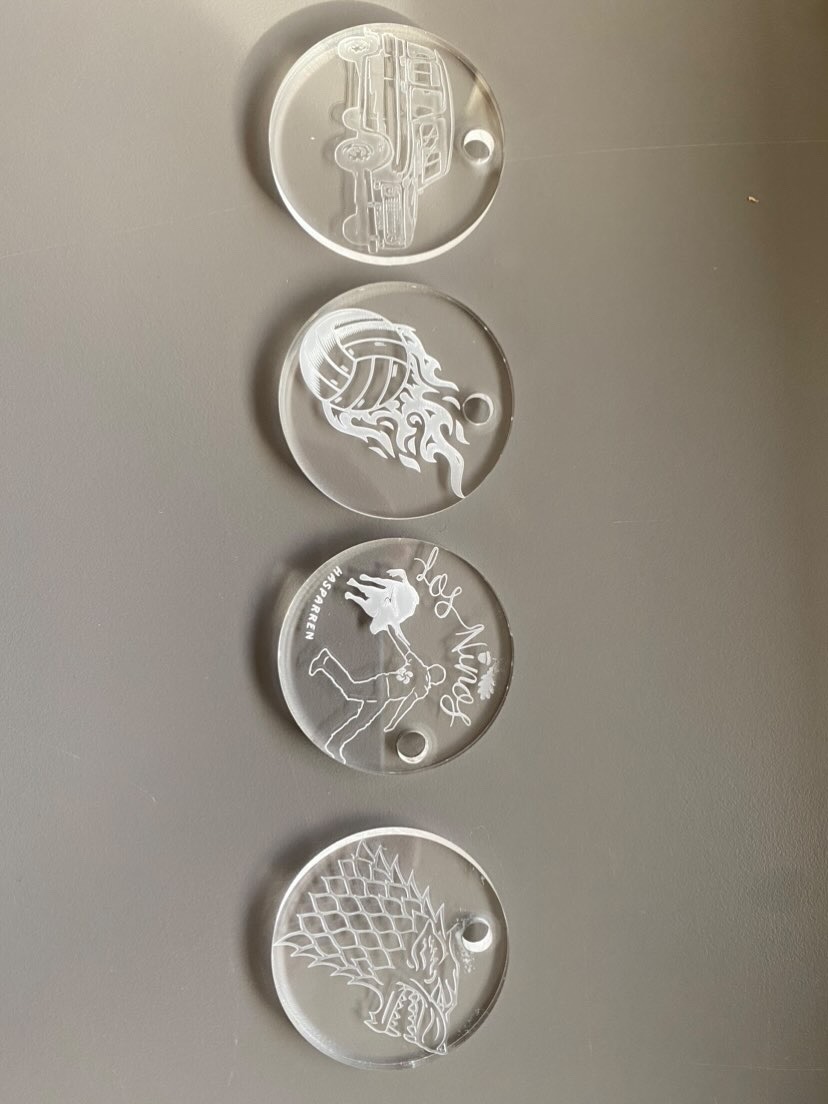 Pour les portes clefs, nous sommes allés chercher des logos sur internet qui nous correspondait. Ensuite nous les avons vectorisé sur Insckape puis dimensionner avec la taille qui nous fallait. Ensuite nous avons mit ces logos dans un cercle et nous avons demandé à la découpe laser de nous couper les parties rouge et de graver les parties bleues. La découpe à durée environ 15 min.