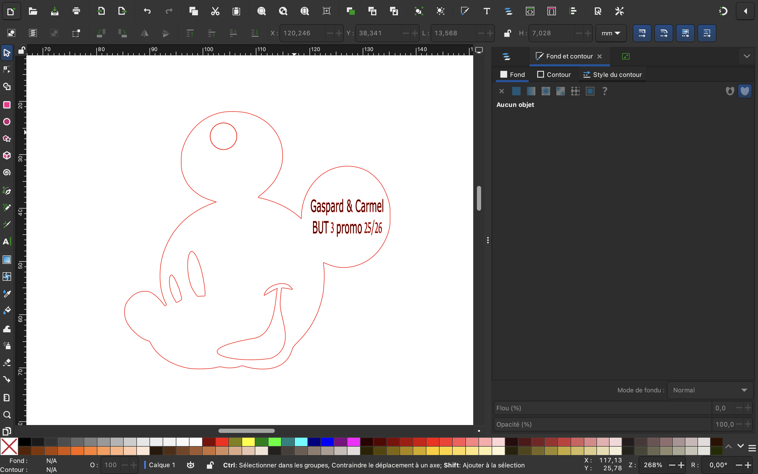 Nous avons travaillé à l’intégration d’une identité visuelle déjà existante, à savoir une tête de Mickey. Pour concevoir la structure du porte-clés, nous avons d’abord importé l’image de cette tête, puis nous l’avons redimensionnée à une largeur de 49,8 mm et une hauteur de 48,3 mm. Par la suite, nous avons procédé à la vectorisation de l’image. Pour cela, nous nous sommes rendus dans l’onglet « Chemin » et avons choisi l’option « Vectoriser un objet matriciel ». La vectorisation a été appliquée sans modification des paramètres, le seuil de détection par défaut étant adapté. Un important travail d’ajustement a ensuite été réalisé à l’aide de l’outil « Nœuds », afin de corriger l’intérieur de la forme et de supprimer correctement les yeux et la bouche. Nous avons également ajouté, dans la partie supérieure gauche, un cercle d’environ 5 mm de diamètre afin de créer l’œillet du porte-clés. Pour les gravures, le texte a été appliqué en fond noir, sans contour. Enfin, pour finaliser le projet, nous avons utilisé l’onglet « Fichier » puis l’option « Enregistrer sous » afin de préparer l’exportation vers la machine.