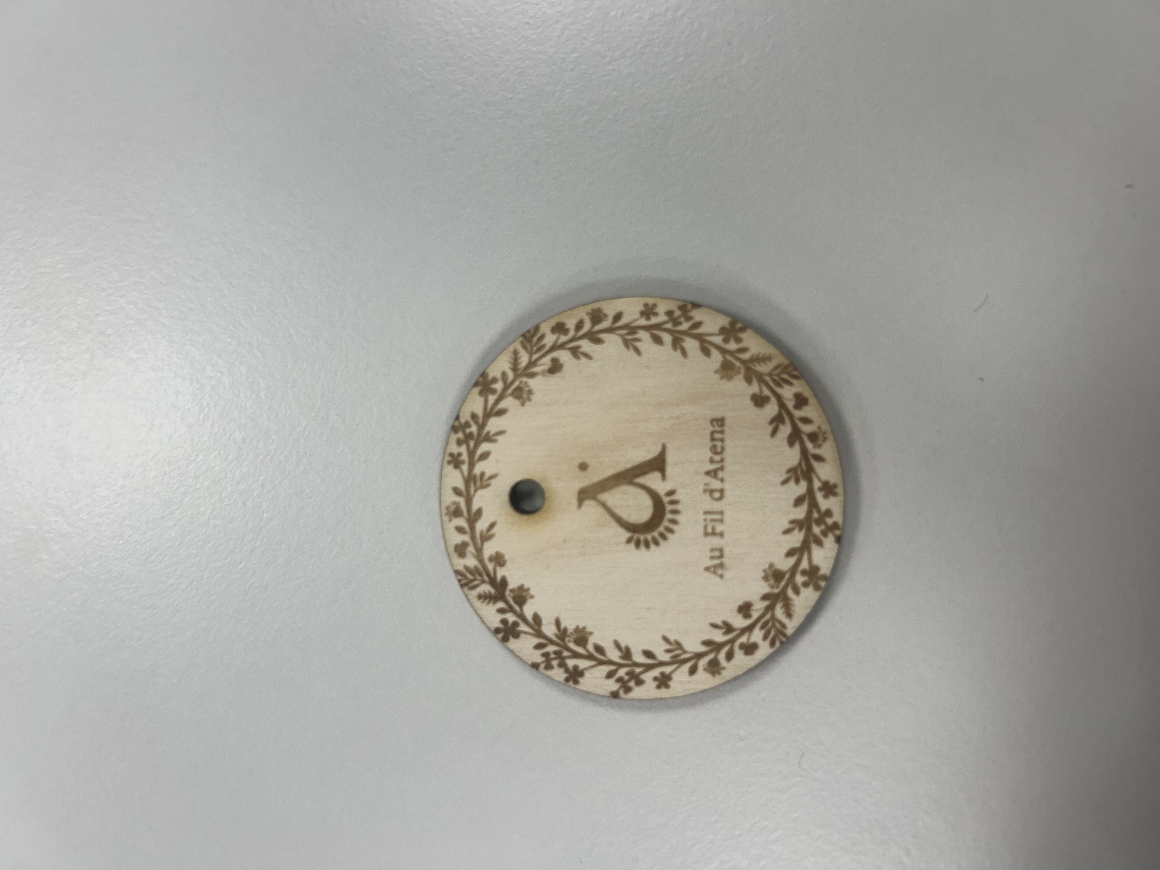 La réalisation de ce porte-clé nous a permis de créer un accessoire destiné à être accroché à nos housses d’ordinateurs personnalisables, ce qui vient enrichir notre projet « Au Fil d’Atena ». Cependant, cette fabrication a nécessité une phase d’adaptation : la prise en main du logiciel, la vectorisation et le choix des éléments décoratifs, notamment la couronne de fleurs, ont d’abord été complexes. Au moment de l’impression, nous avions également une appréhension que la couronne soit découpée par erreur ou mal cadrée. Grâce aux essais et aux ajustements, nous avons finalement obtenu un beau porte-clé dont l’ensemble des éléments apparaît clairement, comme on peut le voir ci-dessous.