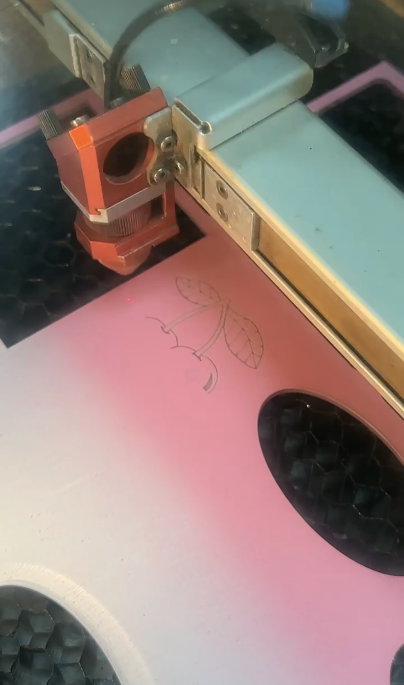 Dans le cadre de l’atelier, nous devons concevoir un porte-clés respectant une contrainte de taille précise : 50 mm par 50 mm maximum. Cette limitation nous pousse à réfléchir à chaque détail et à adapter notre idée aux contraintes techniques. Nous choisissons alors de créer un porte-clés représentant une paire de cerises. Afin de le rendre unique et personnel, nous intégrons nos prénoms directement dans le design, en les faisant suivre la courbe naturelle de la cerise. Voici l'image que nous avons vectorisé.