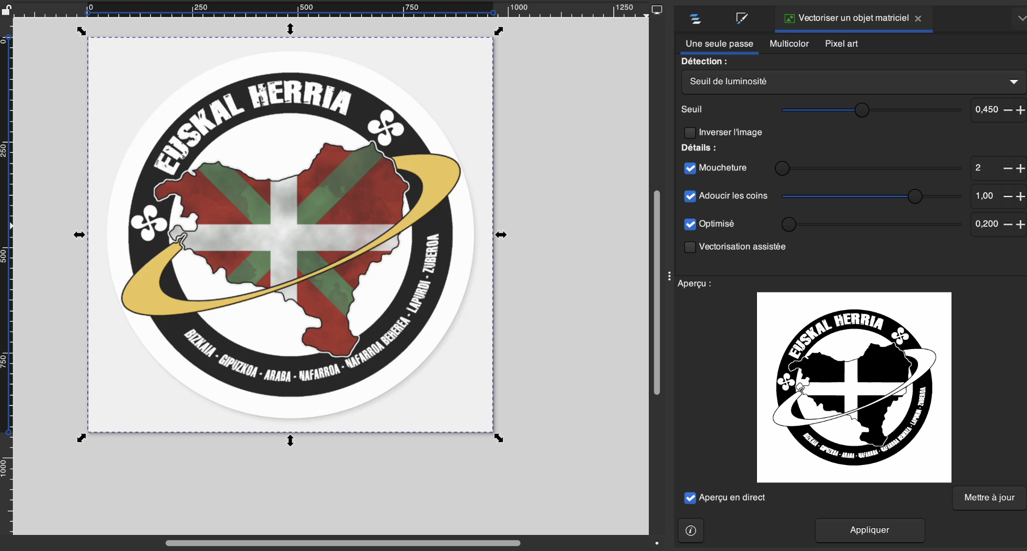 Accès au menu Chemin > Vectoriser un objet matriciel... (ou raccourci Maj + Alt + B).