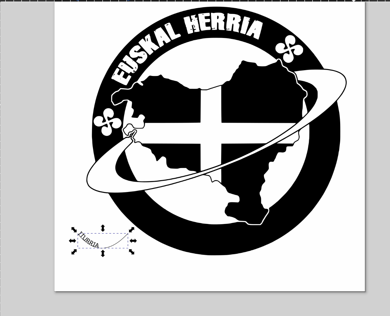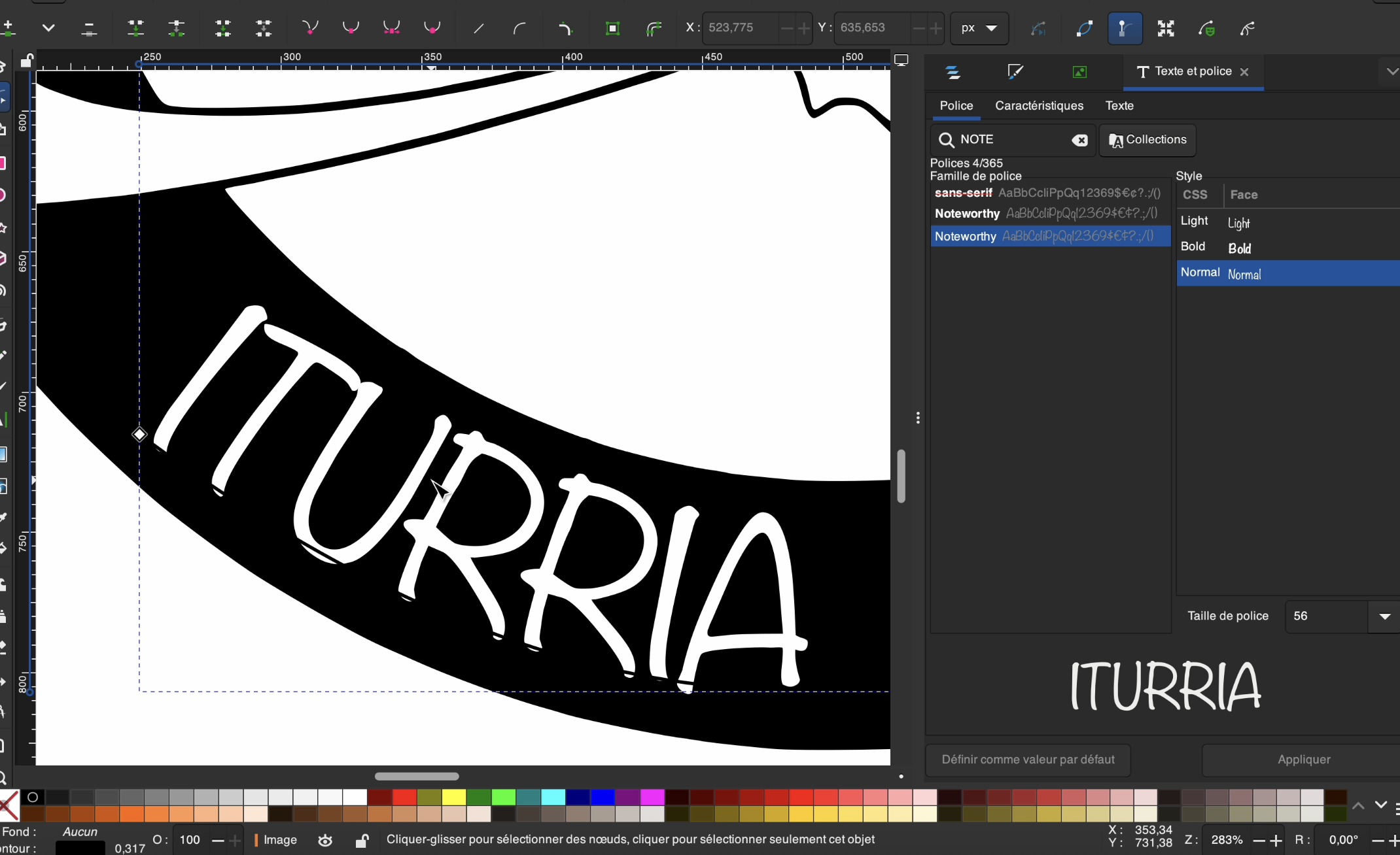 Mise sur chemin : Saisie du texte avec l'outil T, sélection conjointe du texte et de la courbe, puis application de la fonction Texte > Mettre sur le chemin.