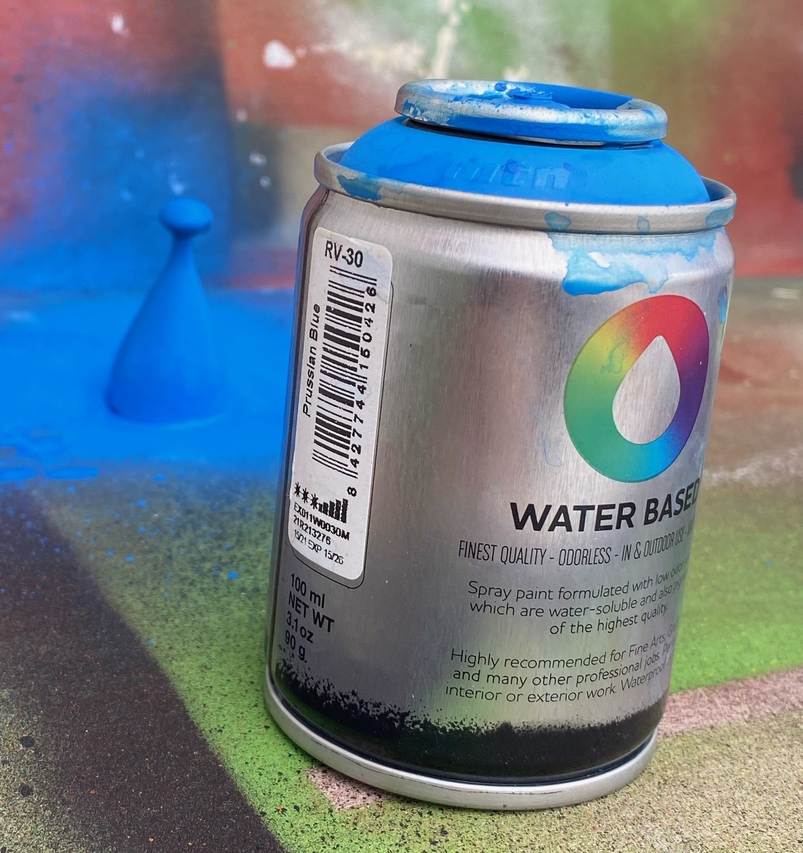(Photo du pion peint avec la bombe de peinture qui a servi, référence peinture: MTN Water Based Paint - Bleu de Prusse (Prussian Blue) - RV - 30)